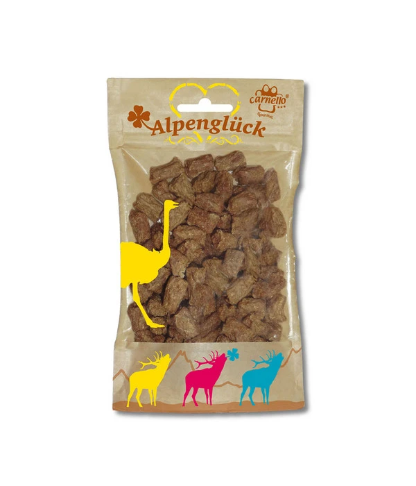 Jedes einzelne Carnello Hundesnack Alpenglück Federleicht, 60g besteht aus sehr leckerem Straußenfleisch in bester Lebensmittelqualität, das – besonders fettarm – auch für Hunde geeignet ist, die ein paar Pfund zu viel auf den Rippen haben. Diese fett- und cholesterinarmen kleinen Hundesnacks werden über Buchenholz sehr schonend getrocknet und sind auch deshalb so wunderbar knusprig. Die Carnello Hundesnack Alpenglück Federleicht, 60g aus 98 % Straußenfleisch liefern Ihrem Hund mit jedem Happen eine kleine Extraportion gesundes Eiweiß – und zwar soja-, gluten- und getreidefrei und ohne jegliche Zugabe von Farb-, Geschmacks- oder Konservierungsstoffen.
