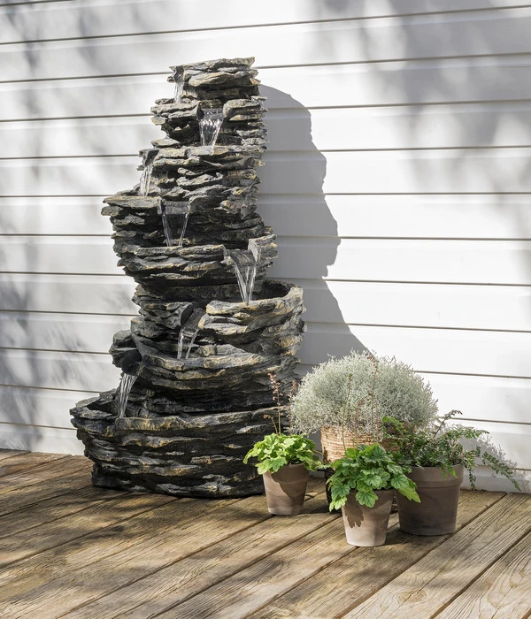 Sie sitzen nach einem anstrengenden Tag endlich auf Ihrer Terrasse, machen es sich mit einem erfrischenden Getränk im Gartenstuhl bequem und lauschen dem beruhigenden Plätschern, das Ihr neuer Dehner Polyresin-Gartenbrunnen Torino von sich gibt. Ihr Blick ruht auf dem beeindruckenden Gartenkunstwerk und schon stellt sich Entspannung ein, der Alltag rückt in weite Ferne. Diese Situation können Sie schon bald jeden Tag genießen. Dass der imposante Gartenbrunnen so außergewöhnlich wirkt, liegt an seinem modernen Design in Natursteinoptik. Gefertigt ist er jedoch aus Polyresin, was ihn witterungsbeständig und langlebig macht. Sie erhalten den attraktiven Brunnen inklusive Pumpe, Trafo und 7-teiliger LED-Beleuchtung, mit deren Hilfe Sie Ihren Dehner Polyresin-Gartenbrunnen Torino abends mit stimmungsvollem Licht in Szene setzen können.