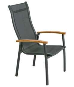 Für den besonderen Sitzkomfort ist vor allem das moderne Gewebe auf der Sitz- und Rückenfläche verantwortlich, das genau den richtigen Mittelweg zwischen angenehm stützen und flexibel nachgeben findet, denn es ist elastisch und formstabil zugleich. Textilene ist außerdem strapazierfähig witterungsbeständig, atmungsaktiv, UV-fest, wasserabweisend und schnell trocknend. Und pflegeleicht ist das Material außerdem. Auch das Aluminium-Gestell des Stuhls ist wetterfest, so dass der Dehner Stapelstuhl ‘Chicago Wood‘ bestens für ein langes Leben unter freiem Himmel ausgestattet ist. Ein ästhetisches Sahnehäubchen sind die Armlehnen aus Teakholz, die die elegante Anmutung des Stuhls unterstreichen.
