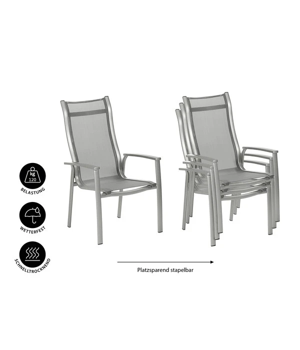 Sie haben es am liebsten, wenn auf Ihrer Terrasse lediglich ein Tisch und zwei Stühle stehen, damit genügend Platz für die Sonnenliege ist? Aber für den nächsten Grillabend müssen 6 oder 8 repräsentative Sitzgelegenheiten griffbereit sein? Dann wird der Dehner Stapelstuhl Chicago Ihnen diese Wünsche gerne erfüllen. Denn er sieht nicht nur elegant aus, sondern er überzeugt mit einer schlauen Funktion: er lässt sich platzsparend aufeinander stapeln. Auf diese Weise können Sie im Schuppen oder Keller ausreichend Stühle bereithalten und auf der Terrasse immer nur die Stuhlanzahl aufstellen, die Sie gerade brauchen. Auf diese Weise passt alles perfekt zusammen und Sie sind auch für spontane Events bestens gewappnet. Wählen Sie gleich die richtige Anzahl für sich aus und freuen sich auf Ihren neuen Dehner Stapelstuhl Chicago!