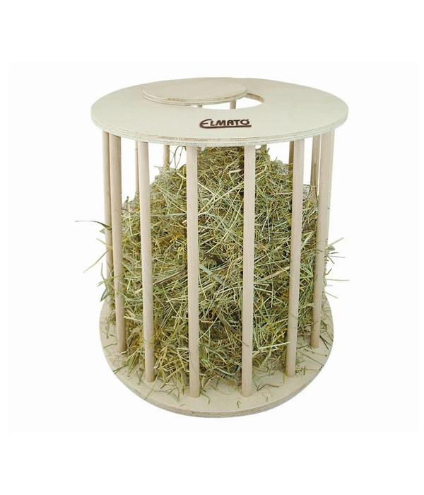 Frisches Heu gehört in jedes Nagerheim. Elmato bietet Ihnen einen optimalen Futterspender für Heu, die Elmato® Heutrommel Mega. Für alle Nagetiere, ob Kaninchen, Hamster, Meerschweinchen oder andere Nagetiere, ist Heu das Grundnahrungsmittel Nummer 1. Daher muss das frische Nagerfutter zu jederzeit im Käfig vorhanden sein. Mit der Elmato® Heutrommel Mega können Sie dies ganz einfach umsetzen. In die Heutrommel passt ausreichend Heu. Da die Elmato® Heutrommel Mega ganz einfach in den Käfig gehängt wird, liegt das Nagerfutter nicht im Käfig rum. Somit bieten Sie Kaninchen, Hasen, Meerschweinchen und anderen Nagetiere stetig sauberes Heu. Die Elmato® Heutrommel Mega ist komplett aus Holz, durch kleine Abstände zwischen den Buchenholzstäben können Ihre Nagetiere an das leckere Heu kommen. Das schmackhafte Nagerfutter in der Elmato® Heutrommel Mega kann von allen Seiten erreicht werden. Durch die verschließbare Öffnung am Decken können Sie das Heu ganz einfach auswechseln bzw. nachfüllen. Zudem sorgt die Heutrommel für mehr Bewegung im Nagerheim. Denn Ihre Nagetiere muss sich etwas anstrengen und strecken um an das leckere Heu heran zukommen. Die Elmato® Heutrommel Mega, eine tolle Kombination von Futter und Spaß für Ihre Nagetiere.
