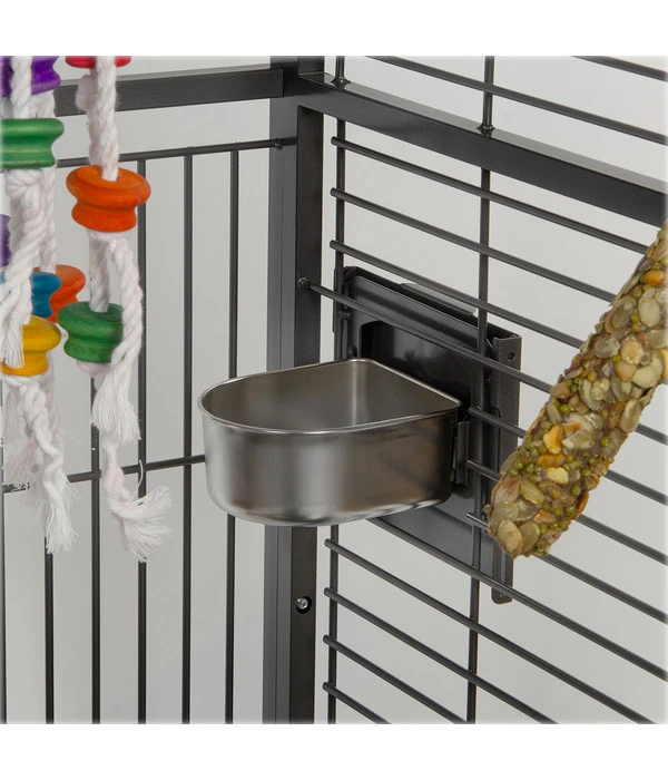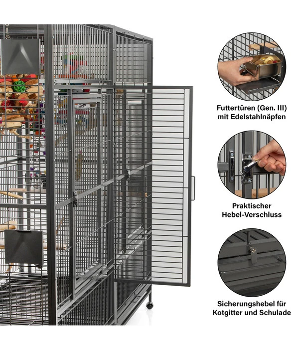Mit dieser schönen Vogelvoliere Arkansas II von Montana können Sie Ihren großen Papageien viel Platz im Vogelkäfig bieten. Die geräumige Voliere für Vögel mit den Maßen 204/194/100 cm (B/H/T) und einer Innenhöhe von 170 cm ist aus schwermetallfreiem Stahl, überzogen mit einer Avilon Pulverbeschichtung, welche speziell für die Vogel- & Nagerhaltung ausgelegt ist. Die verwendete Avilon-Pulverbeschichtung besteht aus einer Kohlenstoff-Polymer-Verbindung. Das Gitter der Vogelvoliere hat eine Maschenweite von 25 mm sowie eine Gitterstärke von 5 mm und ist damit besonders stabil. Zudem verfügt der Vogelkäfig über stabile Rollenfüße und ein entfernbares Kotgitter. Durch die praktische Trennwand in der Mitte kann die Voliere in zwei gleichgroße Käfighälften geteilt werden, beispielsweise um Vögel zeitweise voneinander zu trennen. Wird das Gitter entfernt, haben Ihre gefiederten Liebling auf der gesamte Fläche des Käfigs Platz, um sich zu bewegen. Im Lieferumfang sind außerdem vier Edelstahlnäpfe sowie vier Holzsitzstangen enthalten. Damit sind Sie mit den wichtigsten Utensilien für Vögel ausgerüstet. Außerdem besonders schön: Die Montana Vogelvoliere Arkansas II hat vier Außenfütterungen sowie eine Tür zur Anbringung eines Brutkastens. Das Vogelheim wird ohne Dekoration geliefert.